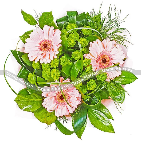 Если ваше сердце околдовано пылкими чувствами, самое время приобрести нежный цветочный букет, чтобы еще раз полюбоваться улыбкой избранницы сердца. Превосходное сочетание нежных герберов, томных зеленых хризантем и зеленого декора делают букет изысканным и романтичным. Такой чудесный презент повернет ваши чувства в новое русло, добавит ярких эмоций и оставит приятный след в мыслях девушки.