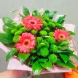 Уменьшенный: гербера розовая - 1 шт, хризантема кустовая зеленая - 3 шт, рускус, берграсс, розовый фетр. Примерный диаметр букета 25х25 см.