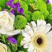 (на фото) роза белая - 5 шт, гербера белая - 3 шт, хризантема кустовая зеленая - 3 шт, статица - 2 шт,салал, фетр из двух слоев - зеленый и фиолетовый, лента. Примерный размер: 25Х25 см.