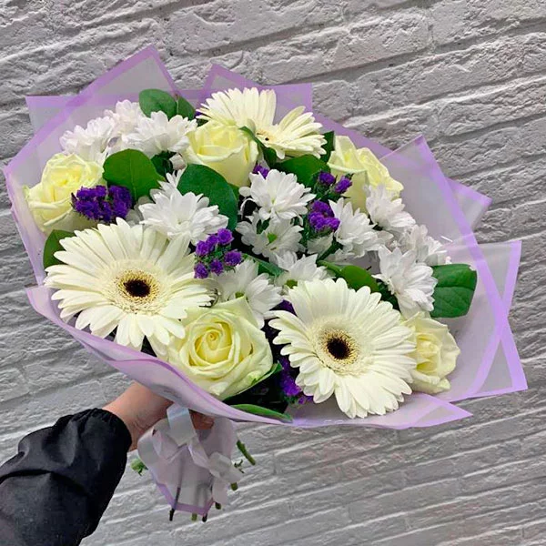 ЛЮКС:  роза белая - 9 шт, гербера белая - 5 шт, хризантема кустовая зеленая - 5 шт, статица - 3 шт,салал, фетр из двух слоев - зеленый и фиолетовый, лента. Примерный размер: 35Х35 см.