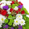 Уменьшенный: хризантема белая кустовая - 2 шт., роза красная кустовая - 2шт., хризантема зеленая кустовая - 3 шт., статица - 2шт., салал, сетка.