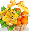 Стандартный: мандарины - 1 кг., конфеты "Ferrero Rocher" - 1 шт., хризантема оранжевая - 2 шт., роза кустовая желтая - 2 шт., декоративная зелень, оазис, корзина средняя, желтый фетр, желто-оранжевый бант.