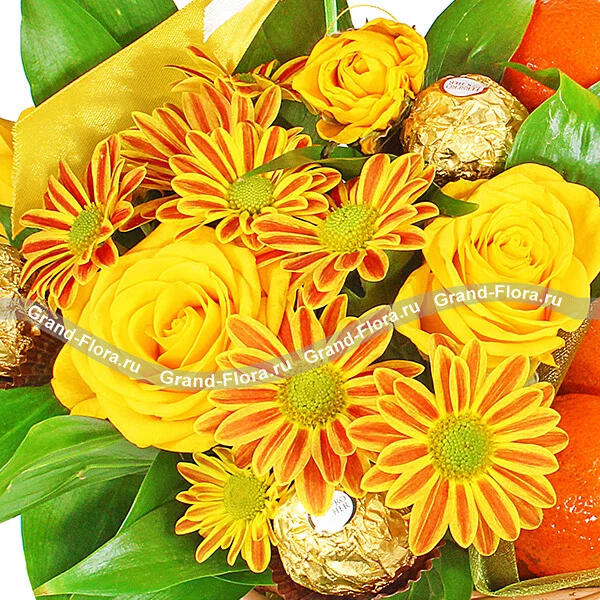 Уменьшенный: мандарины - 0,5 кг., конфеты "Ferrero Rocher" - 1 шт., хризантема оранжевая - 1 шт., роза кустовая желтая - 1 шт., декоративная зелень, оазис, корзина малая, желтый фетр, желто-оранжевый бант.