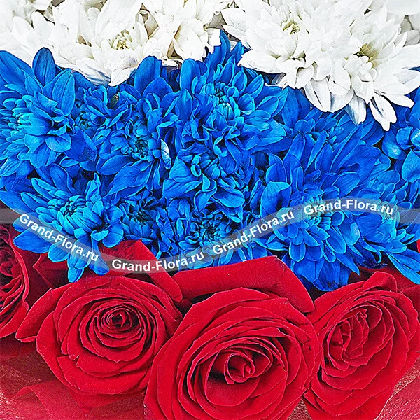 ЛЮКС: роза красная - 11 шт., хризантема синяя - 5 шт., хризантема белая - 6 шт., фетр красно-белый. Перед покупкой уточняйте наличие данного товара