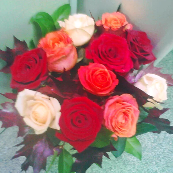 Выигрышное сочетание роз трех оттенков – нежного кремового, страстного красного и пленительного оранжевого – поможет выразить чувство благодарности и уважения. Дополненный осенними листьями букет не оставит равнодушной его получательницу