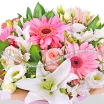 Уменьшенный: роза розовая - 3 шт., гербера розовая - 2 шт., лилия белая - 1 шт., эустома белая - 1 шт., альстромерия белая - 2 шт., фетр розовый, крафт, лента розовая. Примерный размер: 20Х20 см.