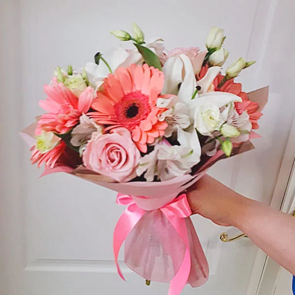 Утонченный микс состоит из элегантных розовых роз, пленительных белых эустом, шикарных лилий и альстромерий, а также из гербер в тон розам. Букет превосходно подойдет на подарок дорогой маме, а также любимой девушке в честь дня рождения.В довершении, можете преподнести его молодоженам в день свадьбы - они по достоинству оценят изящность композиции.
