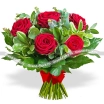 5 роз: роза красная - 5 шт., рускус - 3 шт., эвкалипт - 2 шт., упаковка, бант красный.