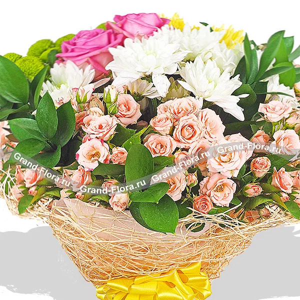 Роза розовая (аква) - 7 шт., роза кустовая розовая - 7 шт., хризантема кустовая белая - 5 шт., хризантема кустовая зеленая - 3 шт., хризантема одноголовая желтая - 5 шт., рускус, натуральная упаковка, желтый бант.