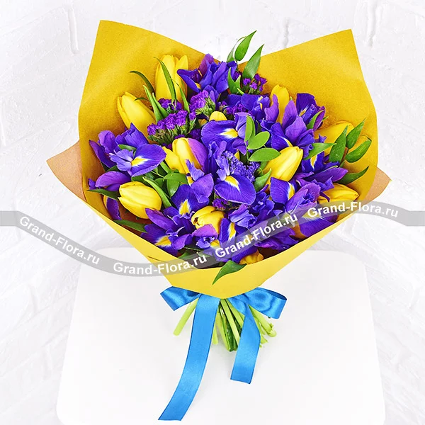 Стандартный: тюльпан желтый - 6 шт., ирис синий- 5 шт., статица, упаковка, лента.