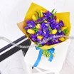 Уменьшенный: тюльпан желтый - 4 шт., ирис синий - 3 шт., статица, упаковка, лента.