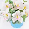 Стандартный: орхидея белая - 7 бутонов, эвкалипт, оазис, коробка. Примерный размер: 25Х30 см.