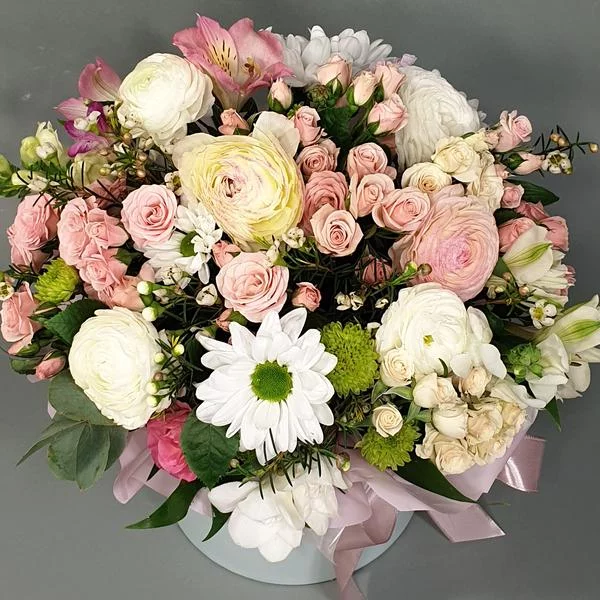 (на фото): роза розовая - 3 шт.,  роза белая - 5 шт.,  кустовая роза розовая - 7 шт., кустовая роза белая - 2 шт., хризантема кустовая ромашковая  белая - 1 шт., альстромерия белая - 2 шт.,  альстромерия розовая - 2 шт., декоративная зелень (хамелациум,львиный зев/возможна замена), оазис, коробка.